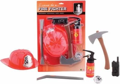 - Deze brandweerset bestaat uit een brandweerhelm, koevoet, brandblusser, badge, bijl en walkietalkie
