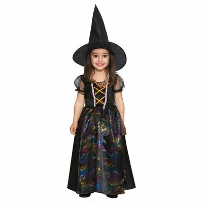 Tover je kleine draak om in een schitterende heks met deze heksenjurk kind – zwart! Heeft je dochter binnenkort een halloweenfeestje, een sprookjesthema op school of een griezeltocht door de buurt? Met deze outfit hoort ze er hélemaal bij. De Heksenjurk kind – zwart heeft doorzichtige pofmouwtjes en een prachtige glinsterende jurk met gekleurde metallic spinnenwebben.. dat is zeker weten indruk maken: met of zonder heksensoep en spreuken!