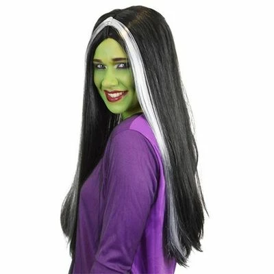 - De heksenpruik is zwart en heeft witte lokken aan de voorkant