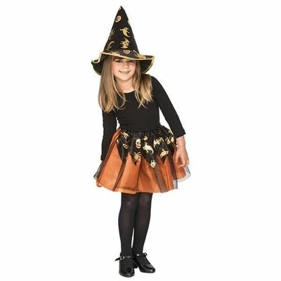 - De Heksenset bestaat uit een orjanje tutu, afgewerkt met een zwart/gouden griezel thema en een heksenhoed