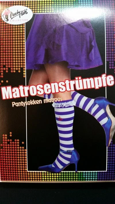 Deze blauw met witte matrozen kousen hebben wij op grote voorraad, super handig als je met een grote groep dames als matroos verkleed gaat!
