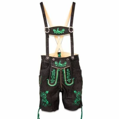 - De Lederhosen donkerbruin met groene stiksels zijn gemaakt van koeienleder