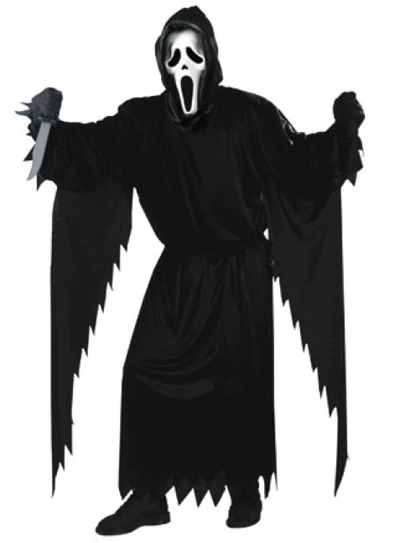 - Het Scream pak bestaat uit de toga met capuchon, riem en masker