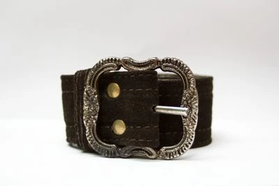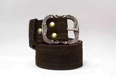 Aan de riem zit een mooie gesp, die ook wordt gebruikt bij de bretels van de lederhosen.